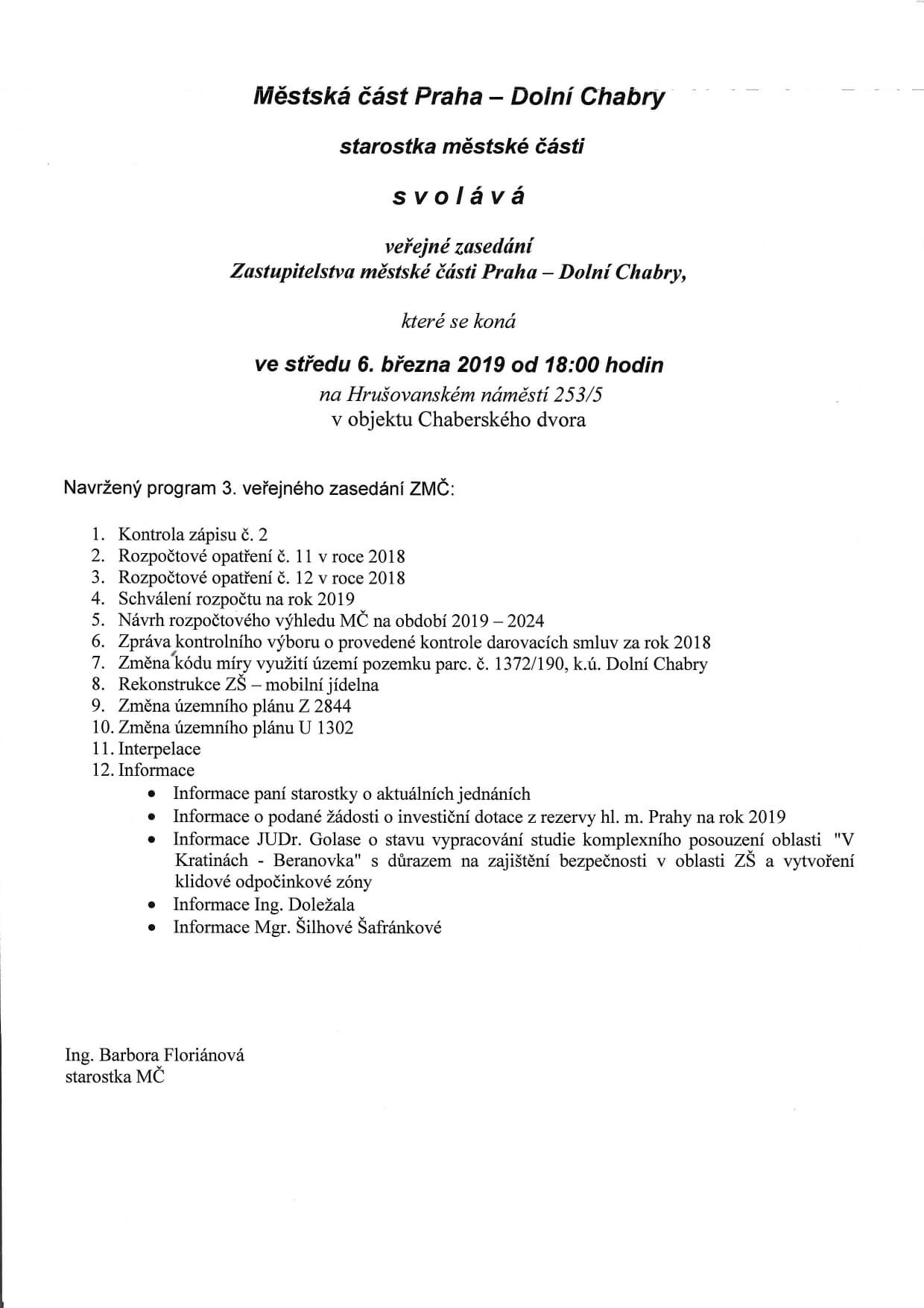 Chaberští zastupitelé se po třech měsících opět sejdou ve Velkém sále Chaberského dvora. Hlavním bodem 3. veřejného zasedání Zastupitelstva MČ Praha-Dolní Chabry ve středu 6. března 2019 od 18:00 hodin bude schválení rozpočtu na letošní rok, bez kterého je městská část odkázána na rozpočtové provizorium. Mezi dalšími body jsou dvě rozpočtová opatření, týkající se ještě předešlého roku, návrh rozpočtového výhledu do roku 2024, zpráva kontrolního výboru o kontrole darovacích smluv za rok 2018, dvě změny územního plánu nebo řešení mobilní jídelny pro základní školu po dobu trvání její dostavby.