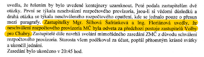 *Aktualizace 22. března 2017: Na 15. zasedání ZMČ dne 15. března 2017 byla při kontrole zápisů z 13. a 14. zasedání ZMČ přijata důvodná námitka Ing. Barbory Floriánové a její jméno tak bylo z inkriminované části zápisu vymazáno. Zastupitelé schválili podobu části textu takto: „Zastupitelka Mgr. Šilhová Šafránková uvedla, že neschválení rozpočtového provizoria MČ byl kapric za předchozí postoje zastupitelů Volby pro Chabry.“