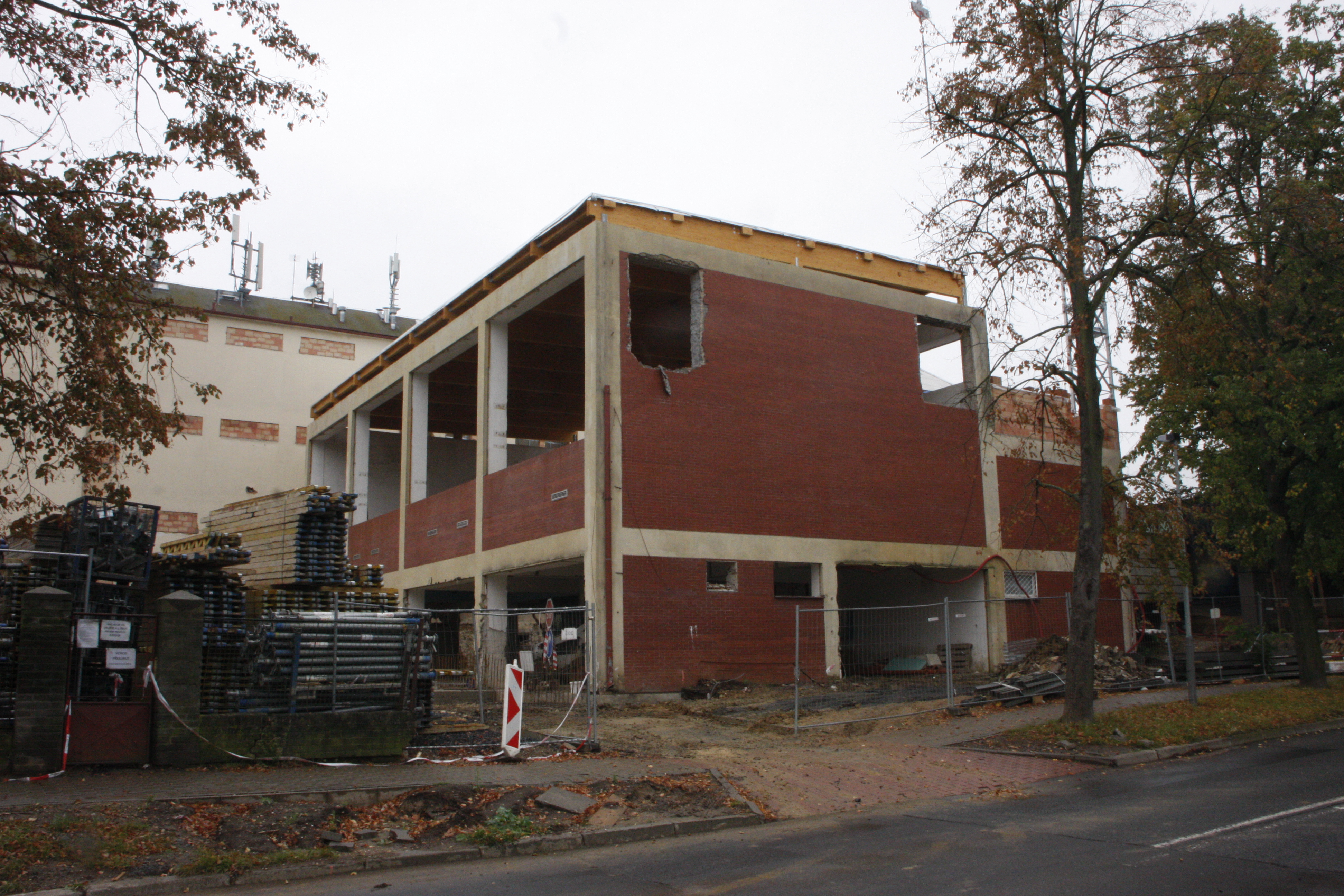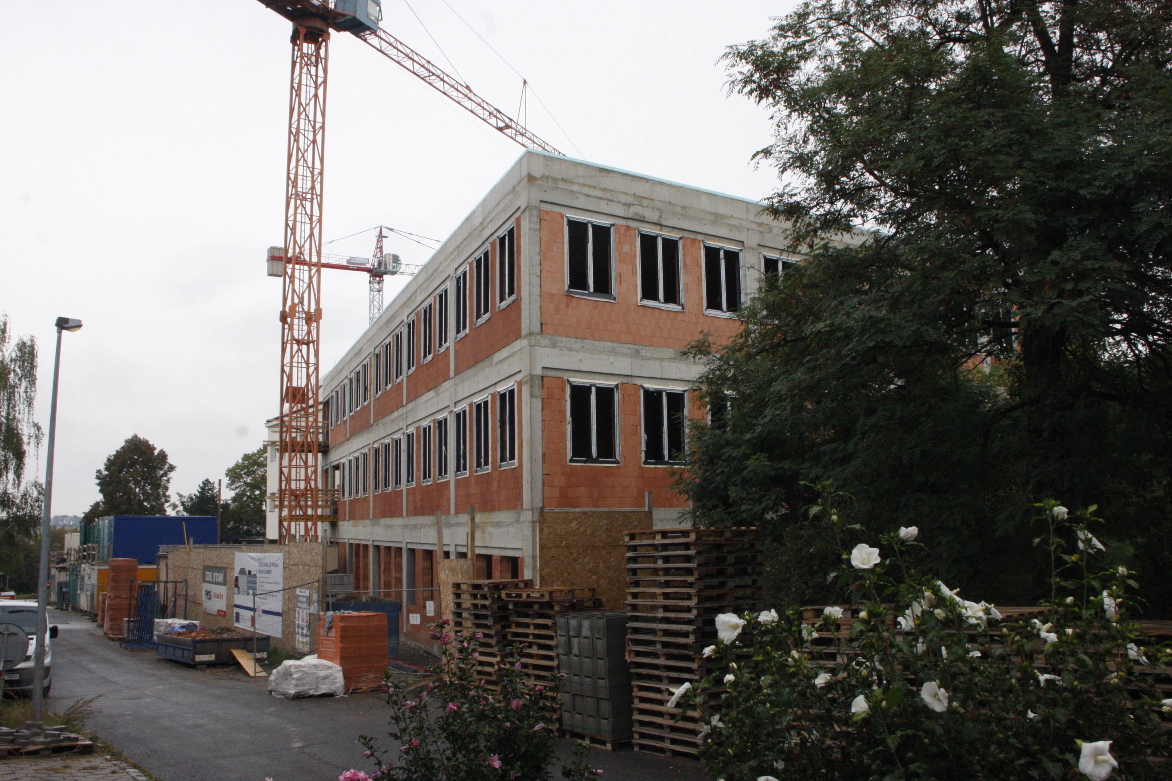 Novostavba jižního křídla má již definitivní tvar. Byly realizovány interiérové příčky a v současnosti probíhá instalace oken. Před dokončením jsou skladební vrstvy střechy.