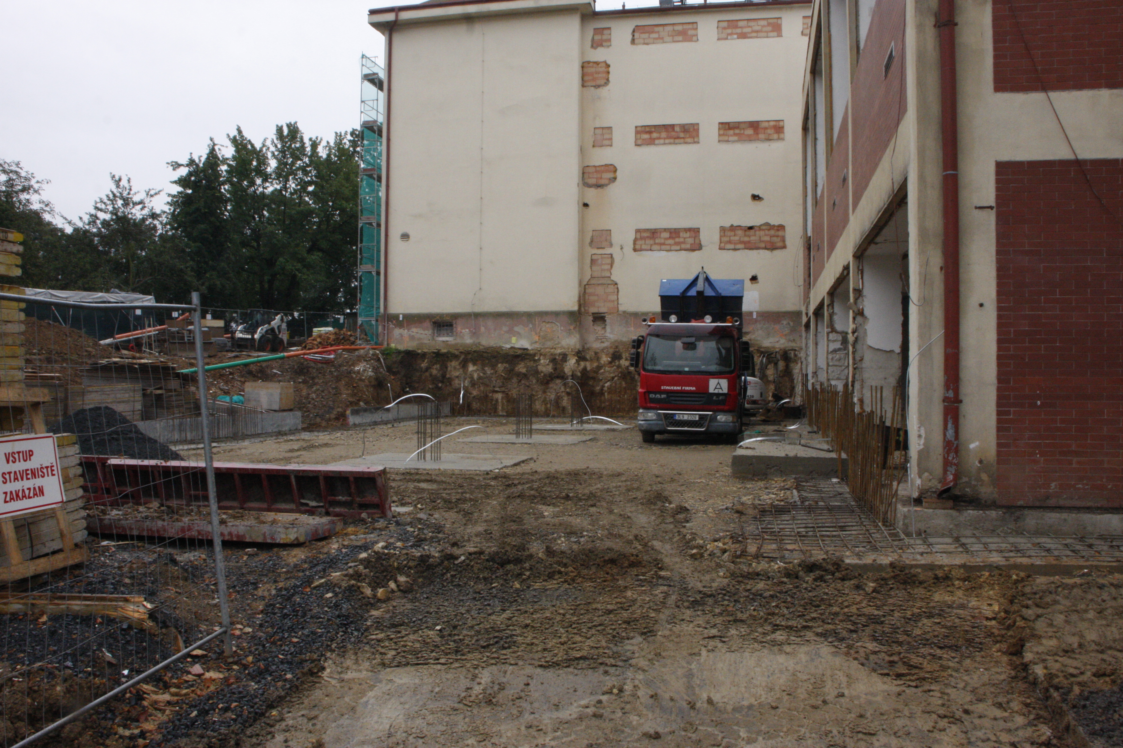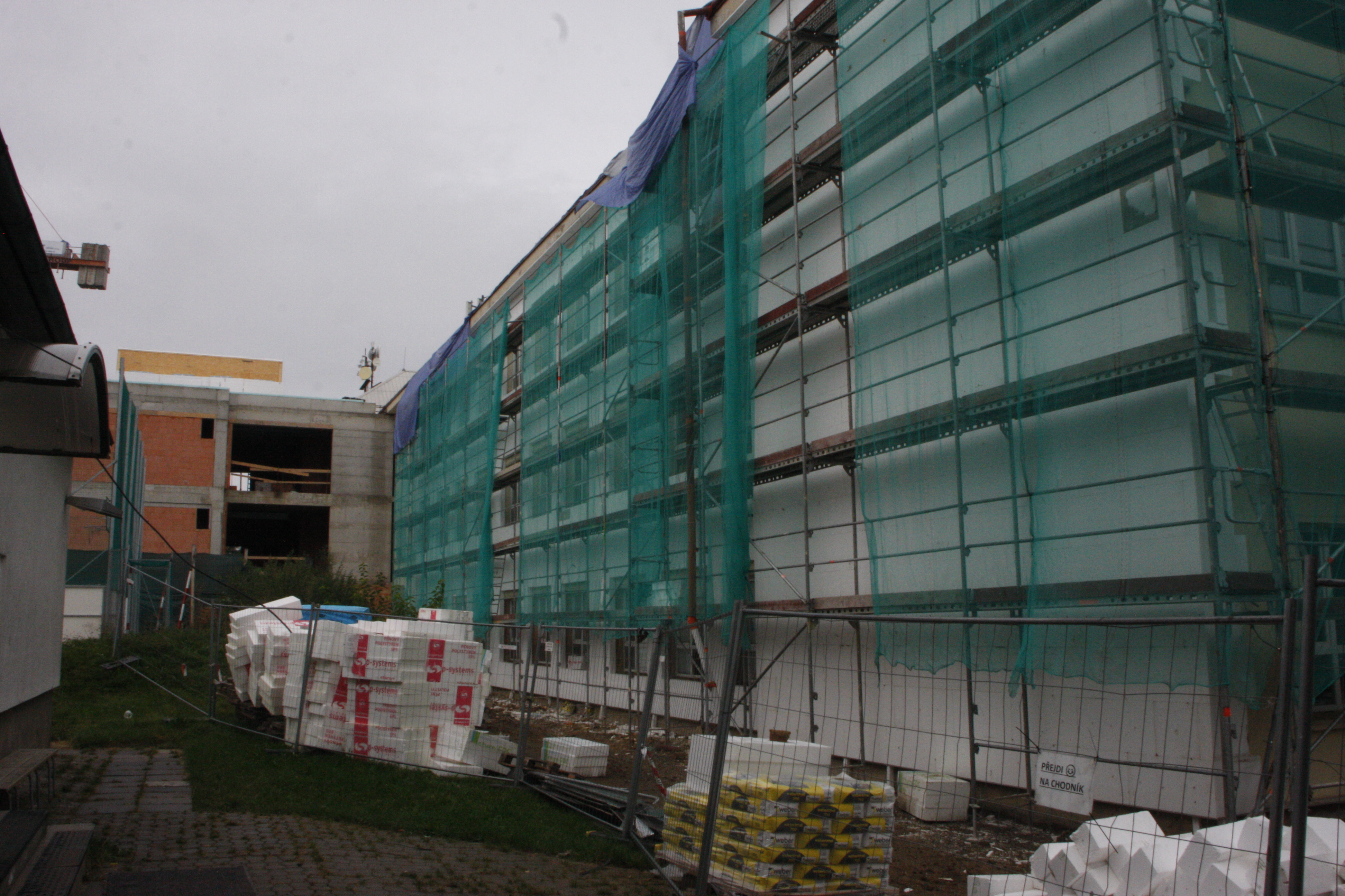 Objekt nových šaten již prošel kontrolou a slouží nyní jako výdejna jídel. Hlavní vstup do školy se i přes barikádu vybavení staveniště stal dominantním prvkem západní fasády. Zateplení objektu „B“ již bylo dokončeno a nyní probíhá instalace polystyrénového pláště na původním objektu „A“.