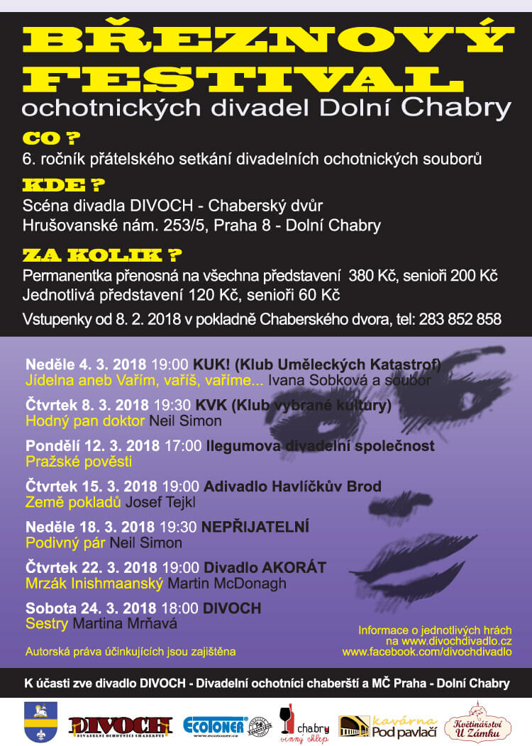 Na úvod tradičního divadelního festivalu vystoupili za spolek Divoch Pavel Fára a Věra Malinová, kteří přivítali čestného hosta režiséra Zdeňka Zelenku. Ten pronesl úvodní slovo, hudební podkres zajistili Milan Pavýza a Jaroslav Hudec. Za městskou část jsem festival zahájil já z pozice starosty MČ.